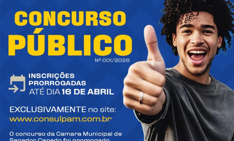 Câmara de Senador Canedo prorroga concurso com 25 vagas e amplia prazo de inscrições até 16 de abril de 2026